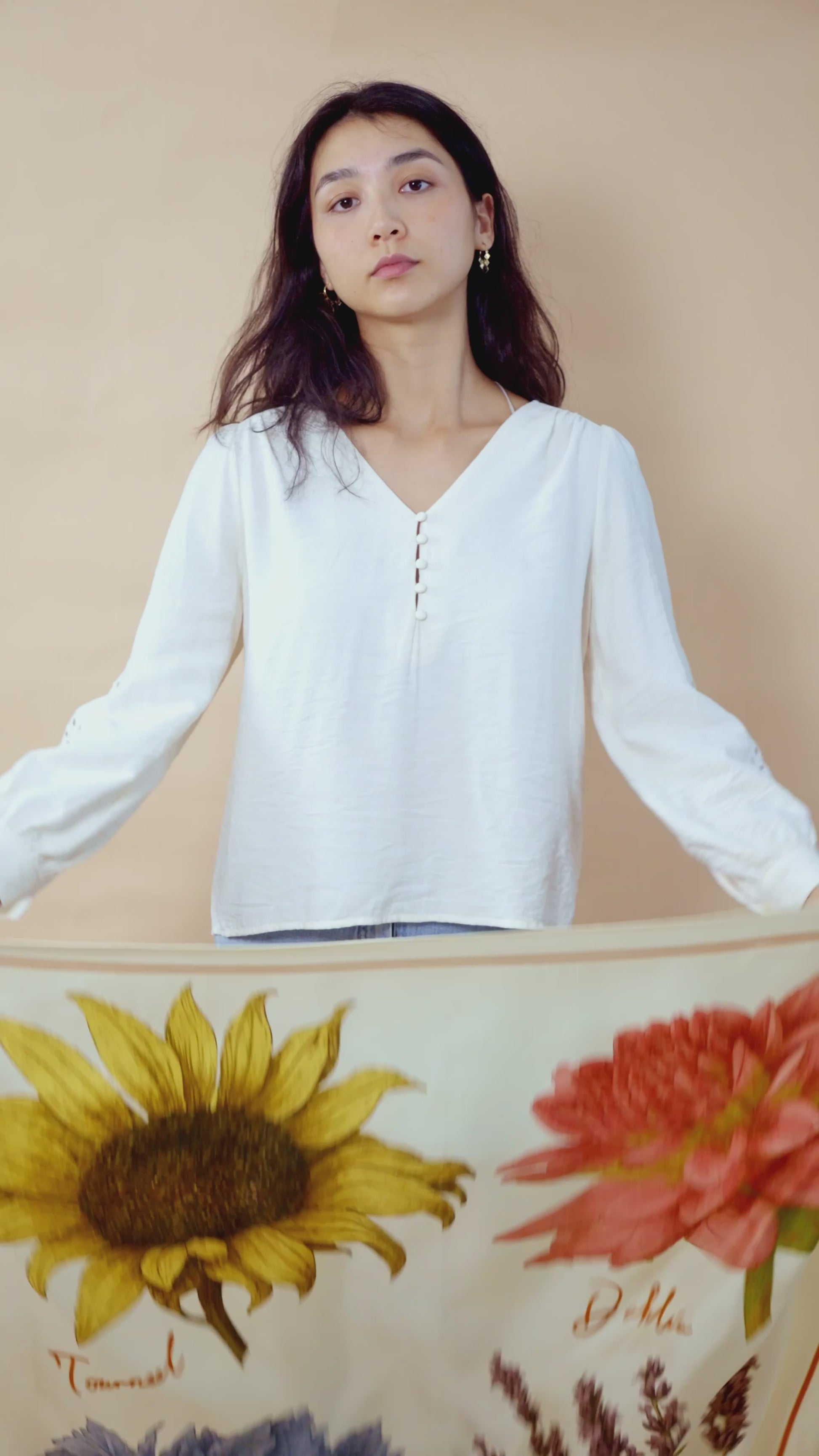 Introducing the Florimanie scarf, a celebration of the enchanting blooms that define a French summer. With its name meaning "summer flower," this exquisite piece elegantly showcases the four quintessential blossoms: Sunflower, Lavender, Dahlia, and Hydrangea, each intricately rendered on luxurious silk. Designed to be worn with subtle grace, the Florimanie scarf adds a touch of floral sophistication to any ensemble. Crafted from 100% premium silk, it offers a soft, refined feel that enhances your wardrobe, whether worn casually or during special occasions. Embrace the beauty of summer in bloom and let the Florimanie scarf become a cherished addition to your collection.